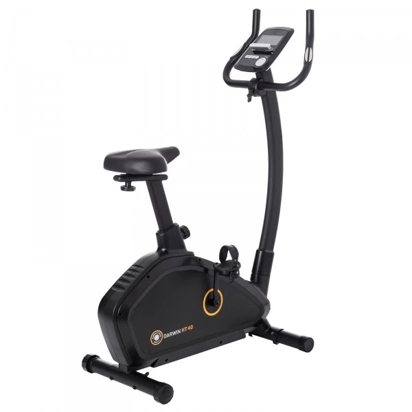 De Darwin Hometrainer HT40 | Fiets Ergometer is een stijlvol beginnersmodel met een goede prijs-kwaliteitverhouding. Je kan er vrijwel meteen mee gaan trainen omdat de hometrainer al grotendeels is gemonteerd. De resterende montage kan worden gedaan in slechts vier eenvoudige stappen. De hometrainer beschikt over 32 weerstandsniveaus en 19 trainingsprogramma’s, waaronder fitness-tests, die je regelmatig kunt doen om je trainingsniveau,- en voortgang te meten. Daarnaast zijn er 12 voorgeïnstalleerde trainingsprogramma’s, zoals een Fartlek-training of een heuveltraining. Je kan je training ook via wattage aansturen. Met 4 hartslaggestuurde programma’s kan je in de gewenste zones trainen. Je hartslag kan je tijdens de training meten met de handsensoren op de hometrainer of een optioneel verkrijgbare borstband. Wil je je kracht en uithoudingsvermogen verbeteren, stel dan de weerstand zo in dat je op 90% van je maximale hartslag traint. De HT40 Hometrainer beschikt tevens over 4 gebruikersprofielen. Elke gebruiker heeft de mogelijkheid een individueel programma samen te stellen en op te slaan. Als je je gegevens opslaat worden de berekeningen, zoals calorieverbruik, nog nauwkeuriger